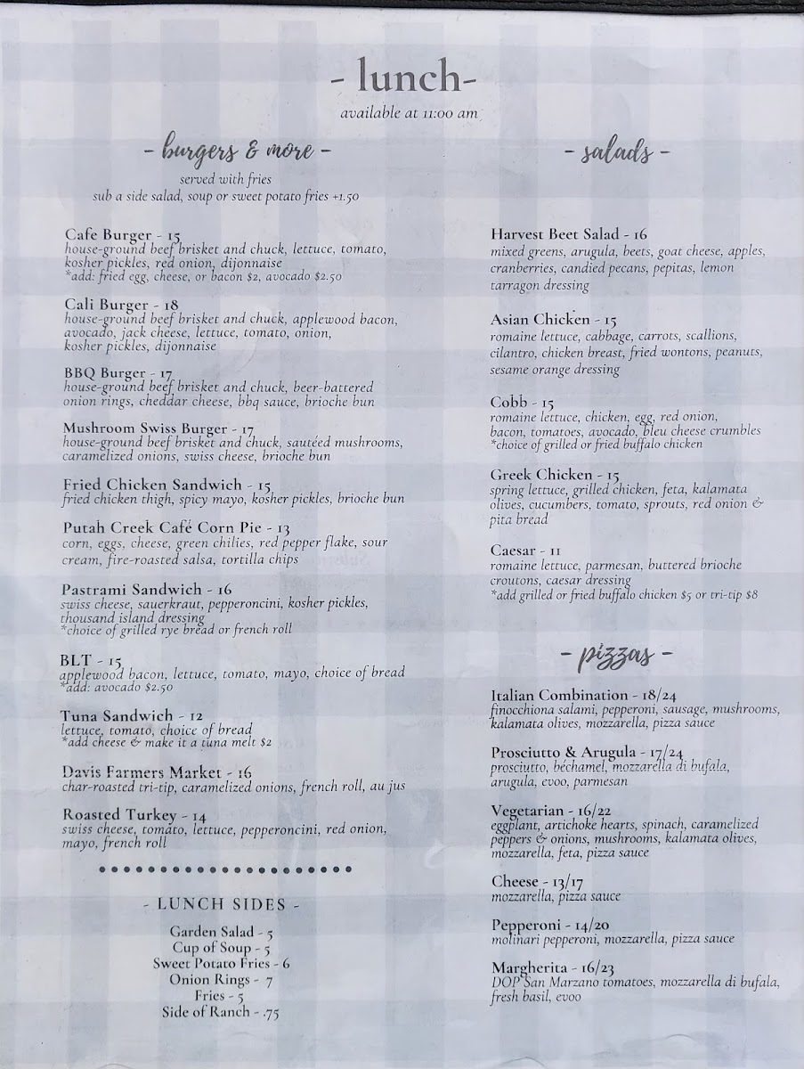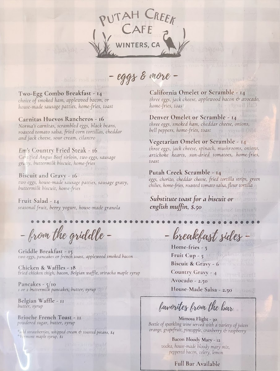 At Putah Creek Cafe, you’re in for a cozy and welcoming dining experience right in the heart of Winters, California. Nestled at 1 Main St, this charming spot offers a diverse menu that satisfies any craving. Whether you're here for a casual meal with friends or a quick bite on the go, you'll find something to delight your taste buds. From hearty breakfast options to fresh salads, juicy burgers, and flavorful sandwiches, each dish is made with care and quality ingredients. The cafe also serves up delicious daily specials, so there’s always something new to try. With a relaxed atmosphere and friendly service, Putah Creek Cafe Menu invites you to sit back, relax, and enjoy good food in great company.